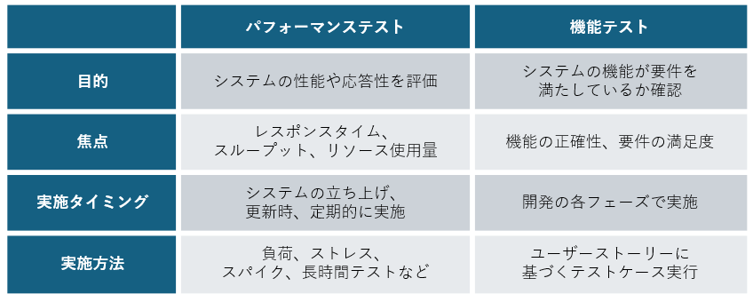 パフォーマンステストと機能テストは、以下のような違いがあります。