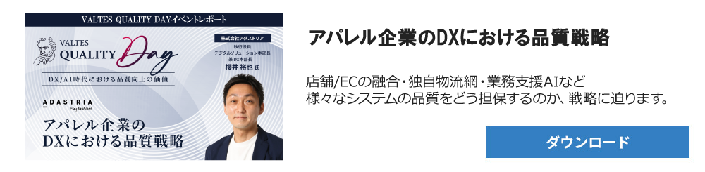 同イベントでは、「アパレル企業のDXにおける品質戦略」をテーマにバルテスの逆井賢と小宮理恵子がアダストリアの櫻井裕也氏と対談を実施。グローバル進出とDXによる変革を迎えているファッション業界において、店舗/ECの融合・独自物流網・業務支援AIなどのさまざまなシステムの品質をどう担保しているのか、その戦略を聞いた。