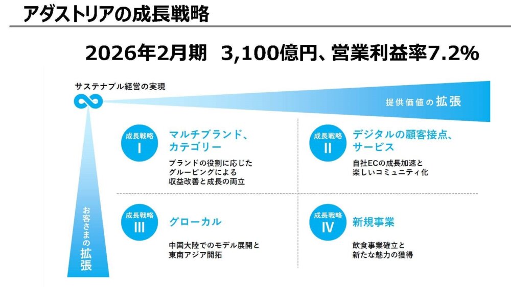 アダストリアは、約4年前に示した中期経営計画で4つの大きな柱を設定。1つ目は収益改善と成長を両立させる「マルチブランド、カテゴリー」、2つ目はECやデジタルを活用して顧客体験を向上させる「デジタルの顧客接点、サービス」、3つ目はグローバルとローカルを掛け合わせた造語でワクワクを海外に届ける「グローカル」、4つ目は飲食を代表とする新たな事業にチャレンジする「新規事業」である。そして、将来的には2026年2月期3100億円、営業利益率7.2%を目指している。
