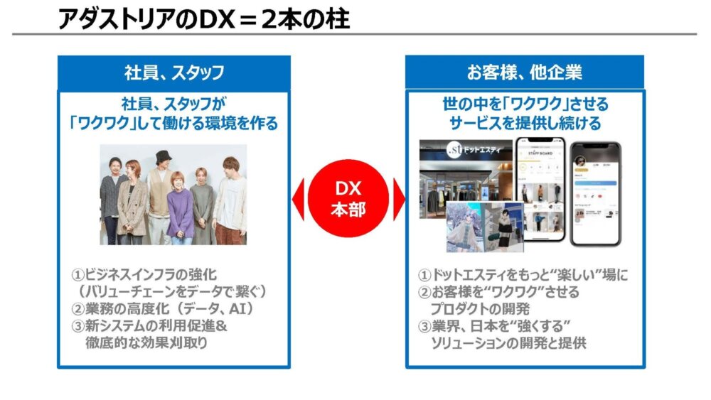 同様に力を入れているのがDXの推進だ。「社員、スタッフが“ワクワク”して働ける環境を作る」「世の中を“ワクワク”させるサービスを提供し続ける」というDXの2本柱を設定。具体的な取り組みとして、自社ECの『.st』ではECを「Electronic Commerce」から「Entertainment Community」に進化させるべく、「スタッフボード」と呼ばれるコンテンツを展開。「4000名以上のスタッフが『.st』内で自身のスタイリングなどの個性を発信することができ、さまざまなお客様に楽しんでもらえるようなコミュニティ作りをしています」と櫻井氏は語る。