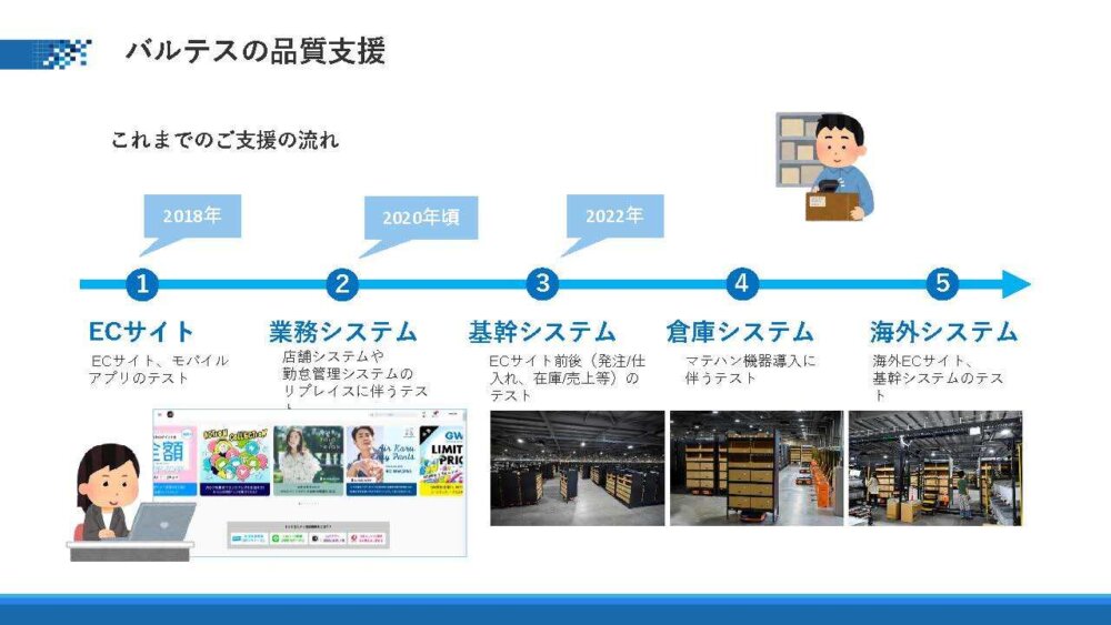 バルテスがアダストリアの品質支援をスタートしたのは2018年。当初は2名体制の小規模なチームで、EC領域のテスト支援を行った。そこから業務システムへのテスト支援などにも領域を拡大し、在庫管理や会計の全システムに関わる2022年の大規模改修に際しては、その全般的なテスト実施をバルテスが担当。これにより、アダストリアのシステム全般に関するノウハウがチーム内に蓄積され、支援対象領域が飛躍的に広がったという。そしてここから現在に至るまで、基幹システムも含めたシステム全般のテスト支援をバルテスが担っている。