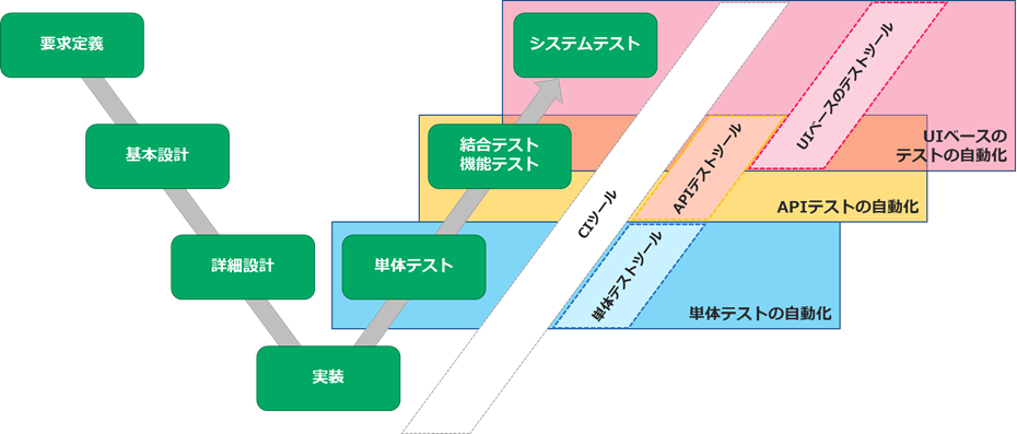 テスト自動化におけるツールの役割は、テストにかかわる作業を人の手にかわって実行することです。テスト自動化ツールは、開発のフェーズによって適切なものは変わります。ソースコードをテストする単体テストツール(ユニットテストフレームワーク)、APIのテストをするAPIテストツール、UI(ユーザーインターフェース)ベースのテストをするUIベースのテストツールなどがあります。これらのツールを統合して運用するCI(継続的インテグレーション)ツールを利用して、インテグレーションのエラーを素早く検知、修正でき、ソフトウェアをより迅速に開発できるようになります。