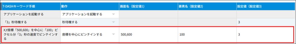 | 要素名(設定値2) | 中心からピンチインする距離(ピクセル数)を半角数字(少数点可)で入力する |