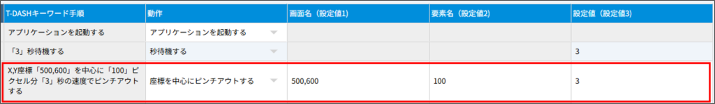 | 要素名(設定値2) | 中心からピンチアウトする距離(ピクセル数)を半角数字(小数点可)で入力する |