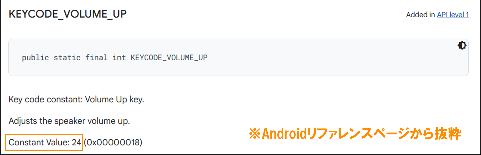 キーコードの定数値(Constant Value)や、利用可能なキーコード一覧は、Androidリファレンスより確認可能です。