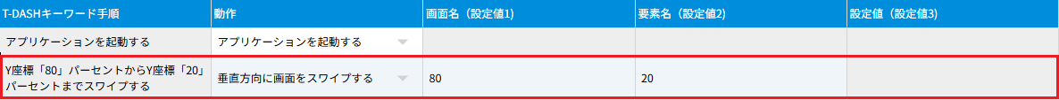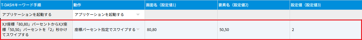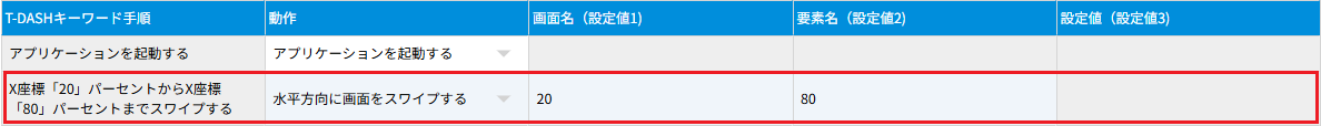 - 開始位置と終了位置のX座標、Y座標(パーセント)を指定し、それに沿って画面をスワイプします。