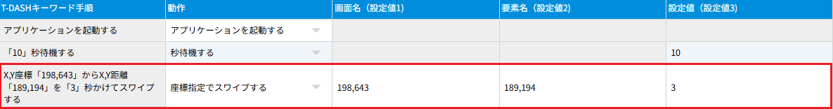 - 開始位置と終了位置のX座標、Y座標(絶対値)を指定し、それに沿って画面をスワイプします。