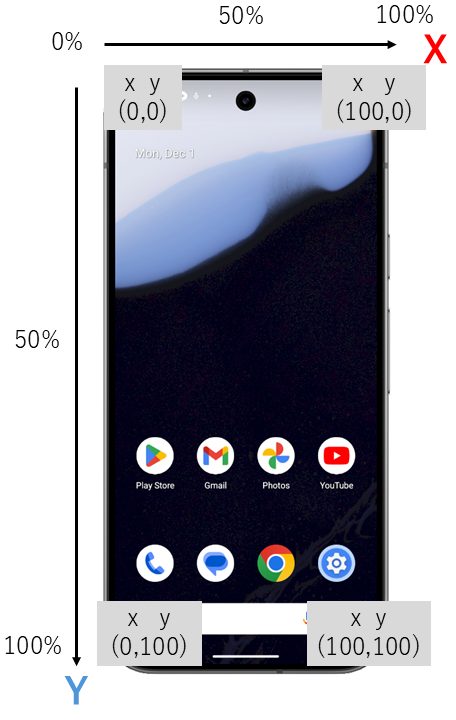 座標は、現在表示されている画面の横幅と縦幅をそれぞれ100%として、X座標、Y座標ともに割合(%)で指定します。