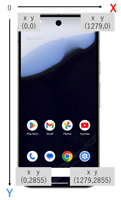 ・画面の右最下部の座標(最大座標)は、端末の物理解像度から 1 を引いた値 になります。