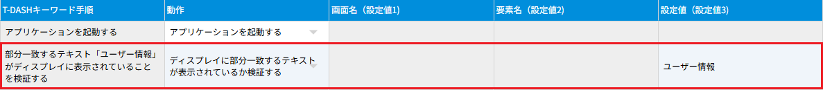 - 指定したアプリケーション要素のテキストが「設定値」で指定した文字列と部分的に一致するか検証します。