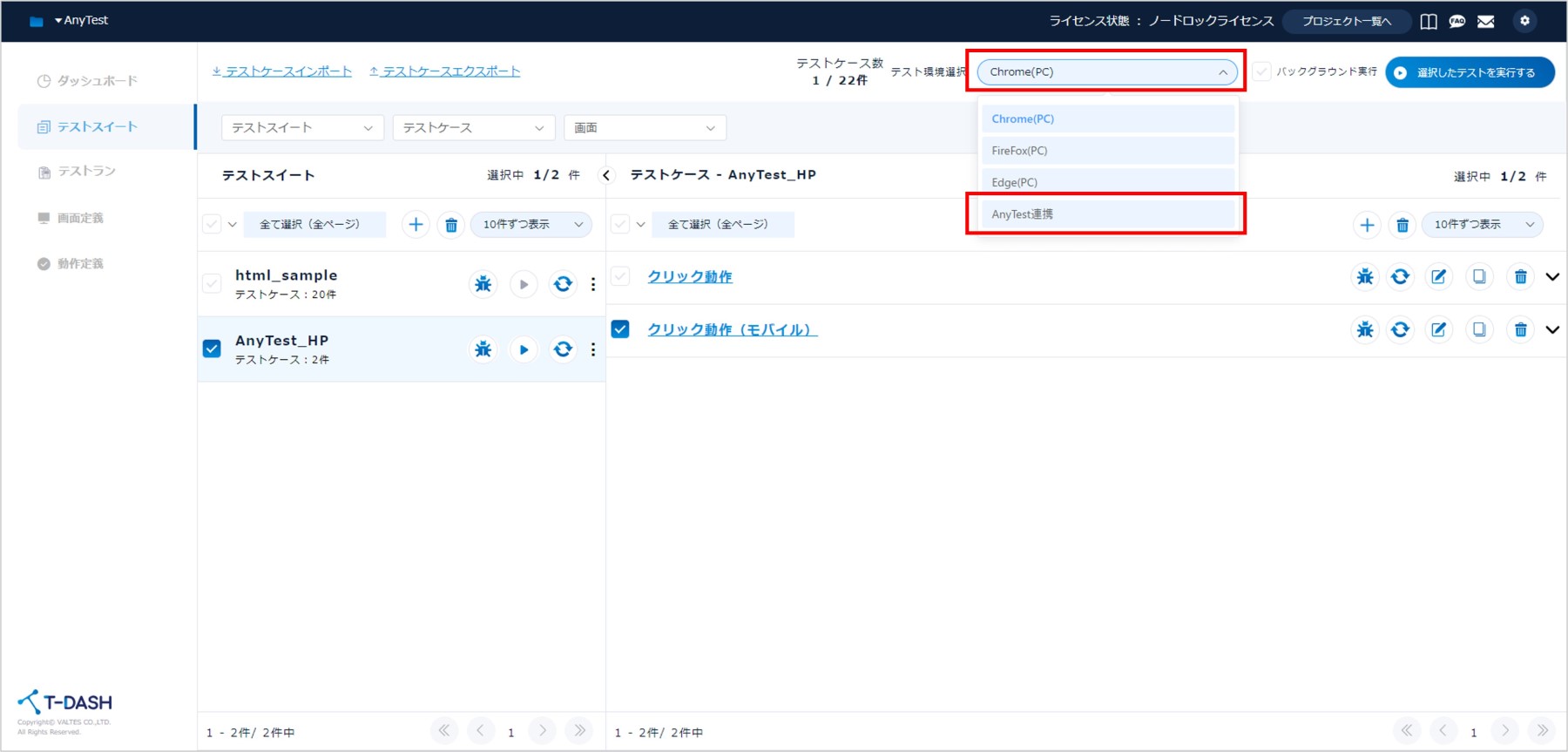1.実行したいテストケースを選択し、「テスト環境選択」より「AnyTest連携」をクリックします。