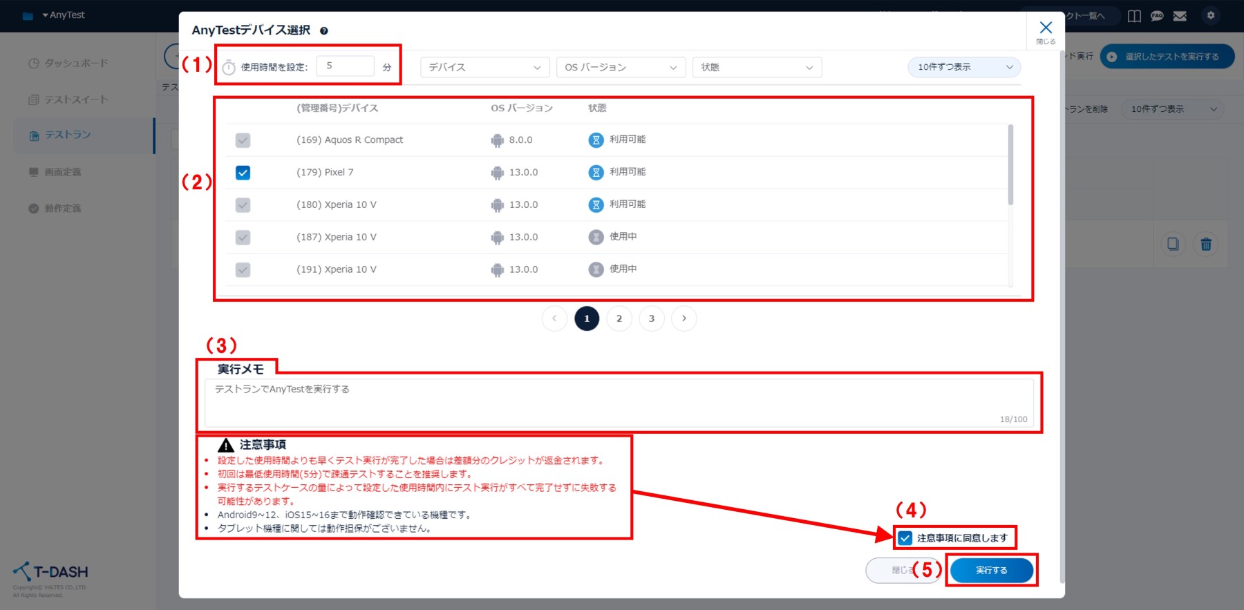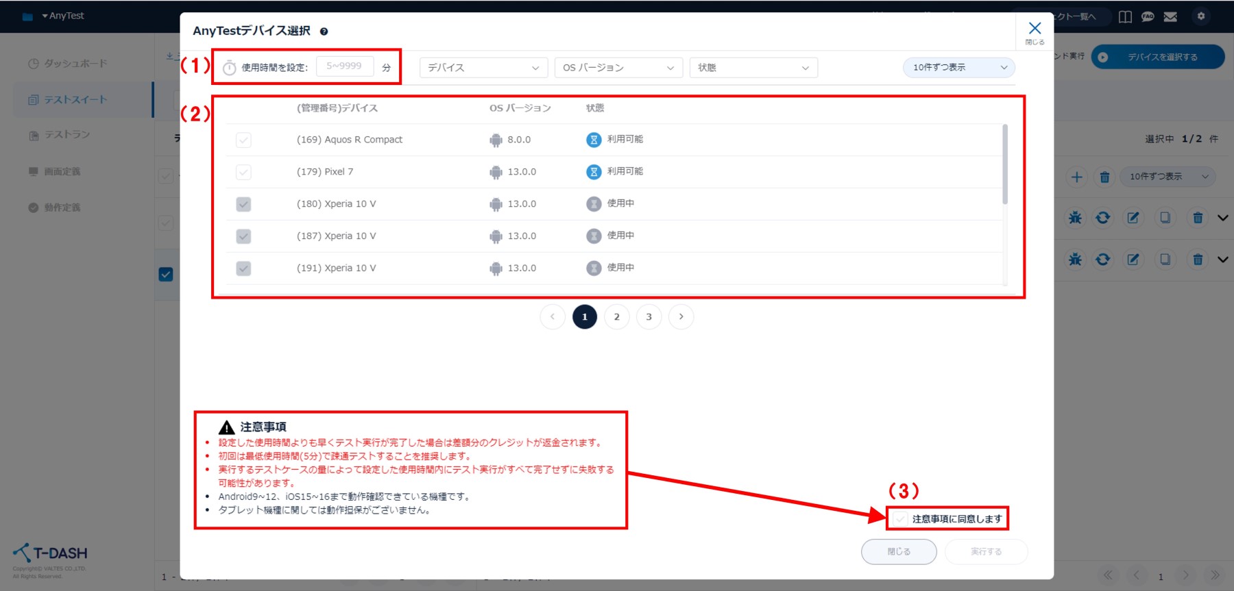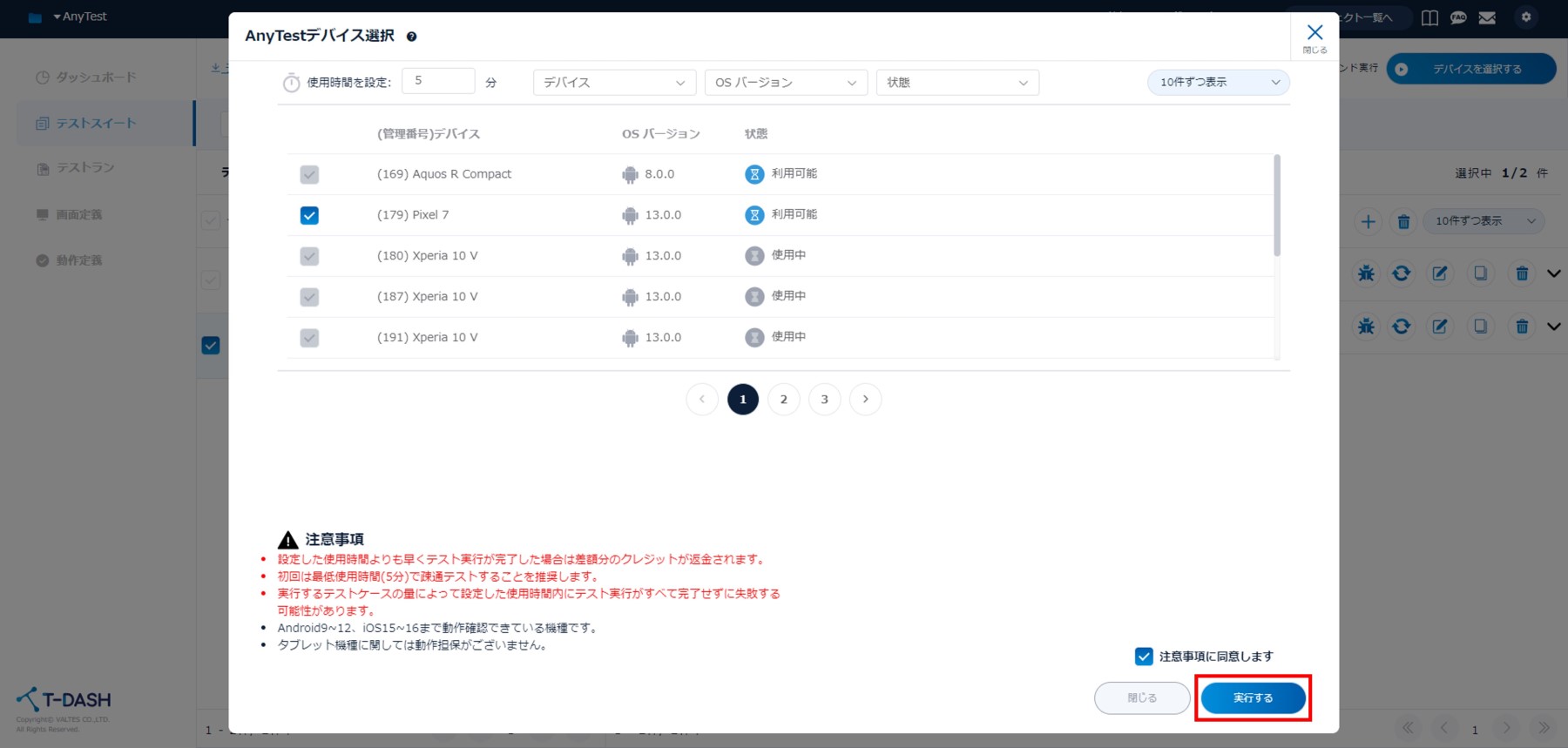 AnyTest実行中にT-DASHを閉じた場合、使用時間分がフルでクレジット消費されます。