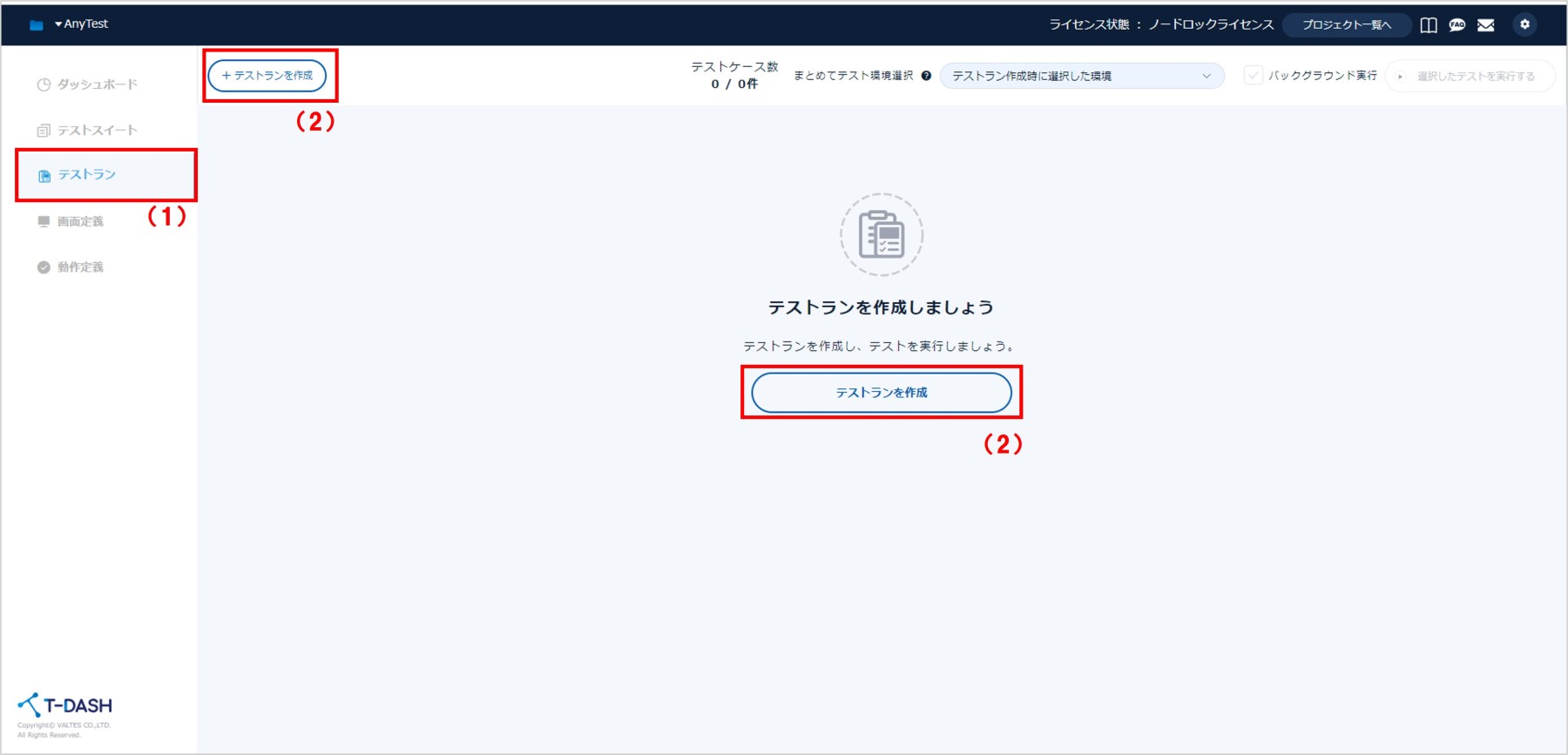 1.(1)「テストラン」タブから、(2)「テストランを作成」をクリックします。