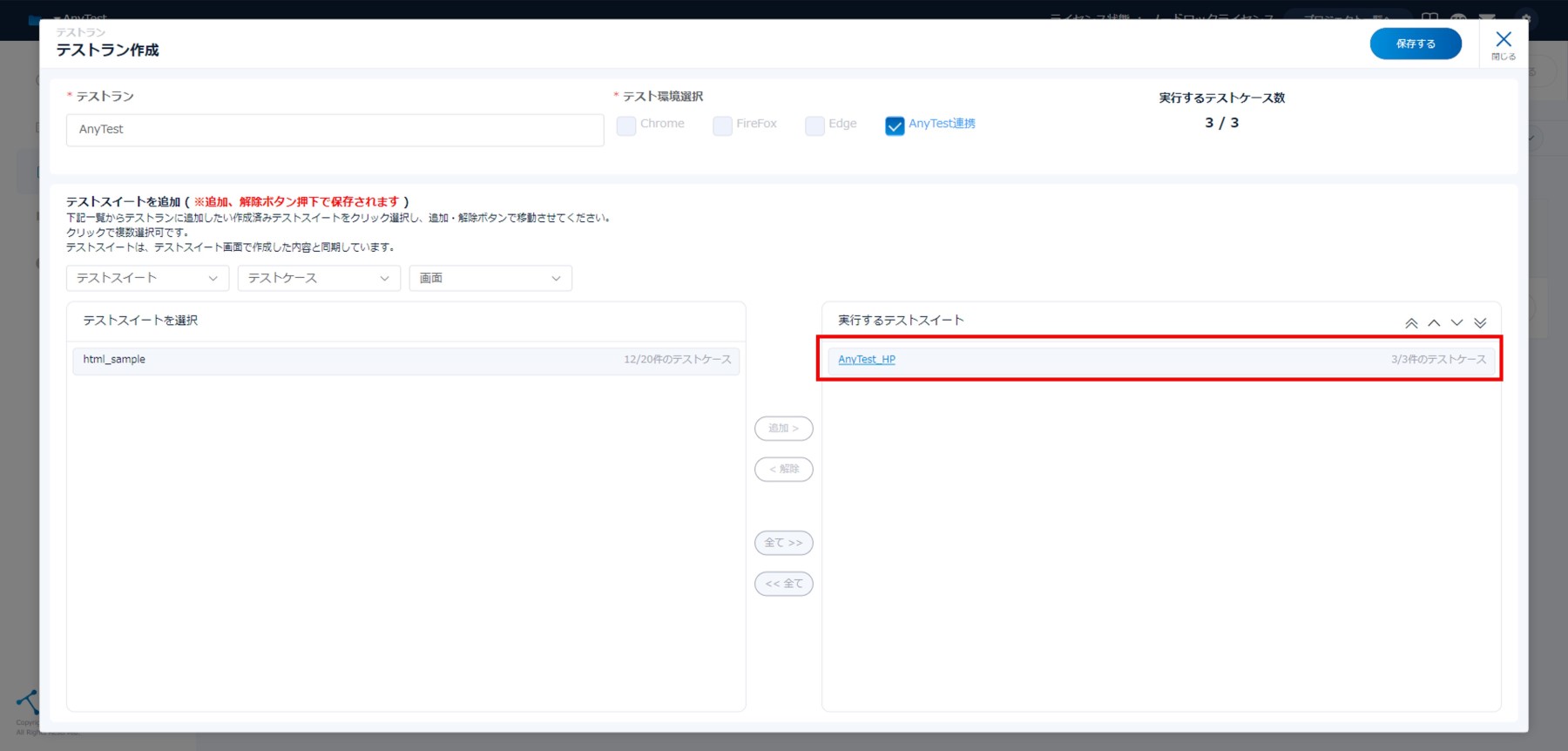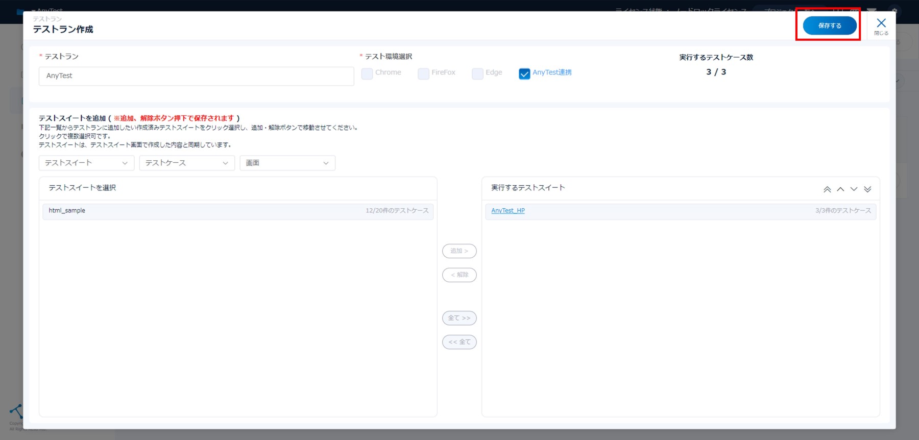 7. 「保存する」をクリックし、作成したテストランを保存します。
