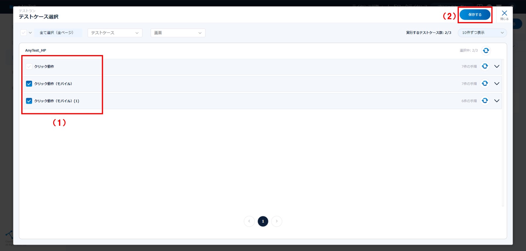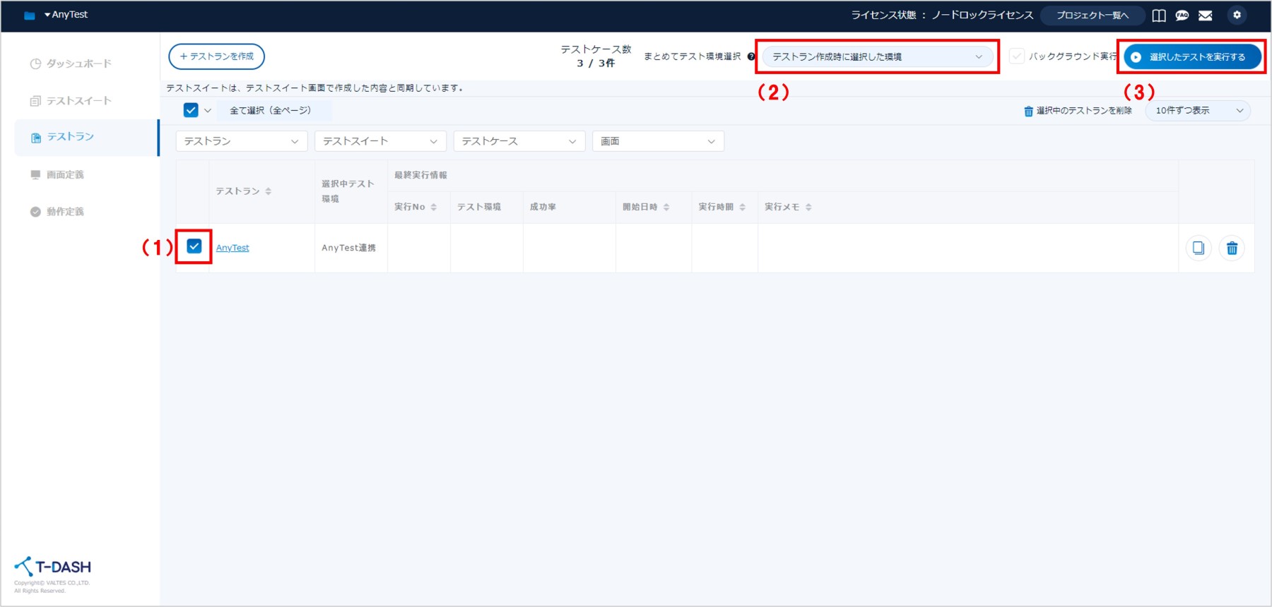 (1)実行するテストランにチェックします。