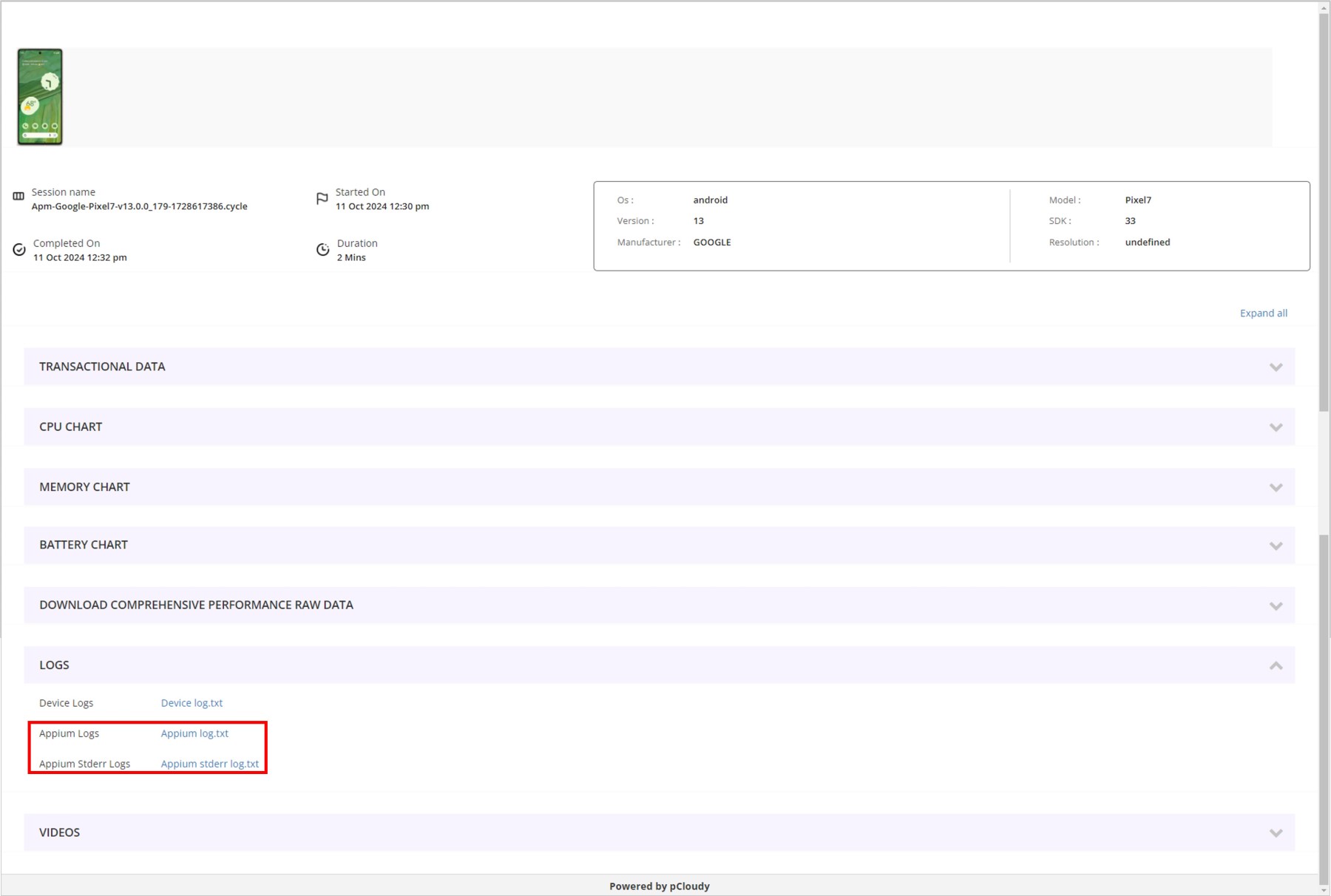 3. AnyTest連携ではAppiumサーバーのログを確認できます。