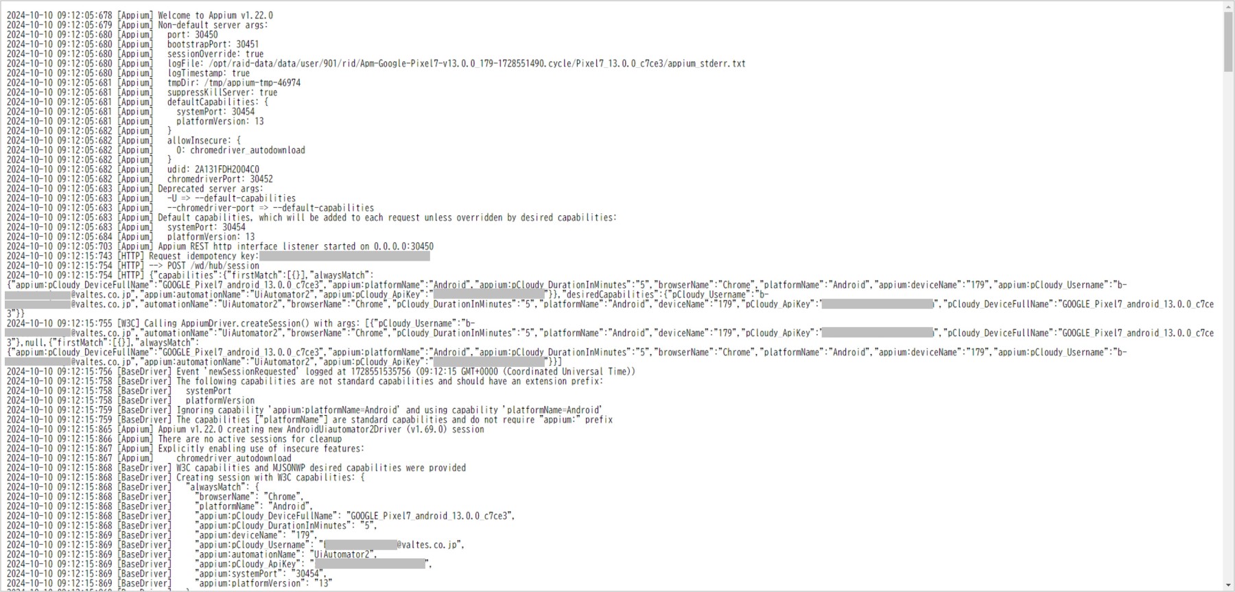 Appiumサーバーのログ
