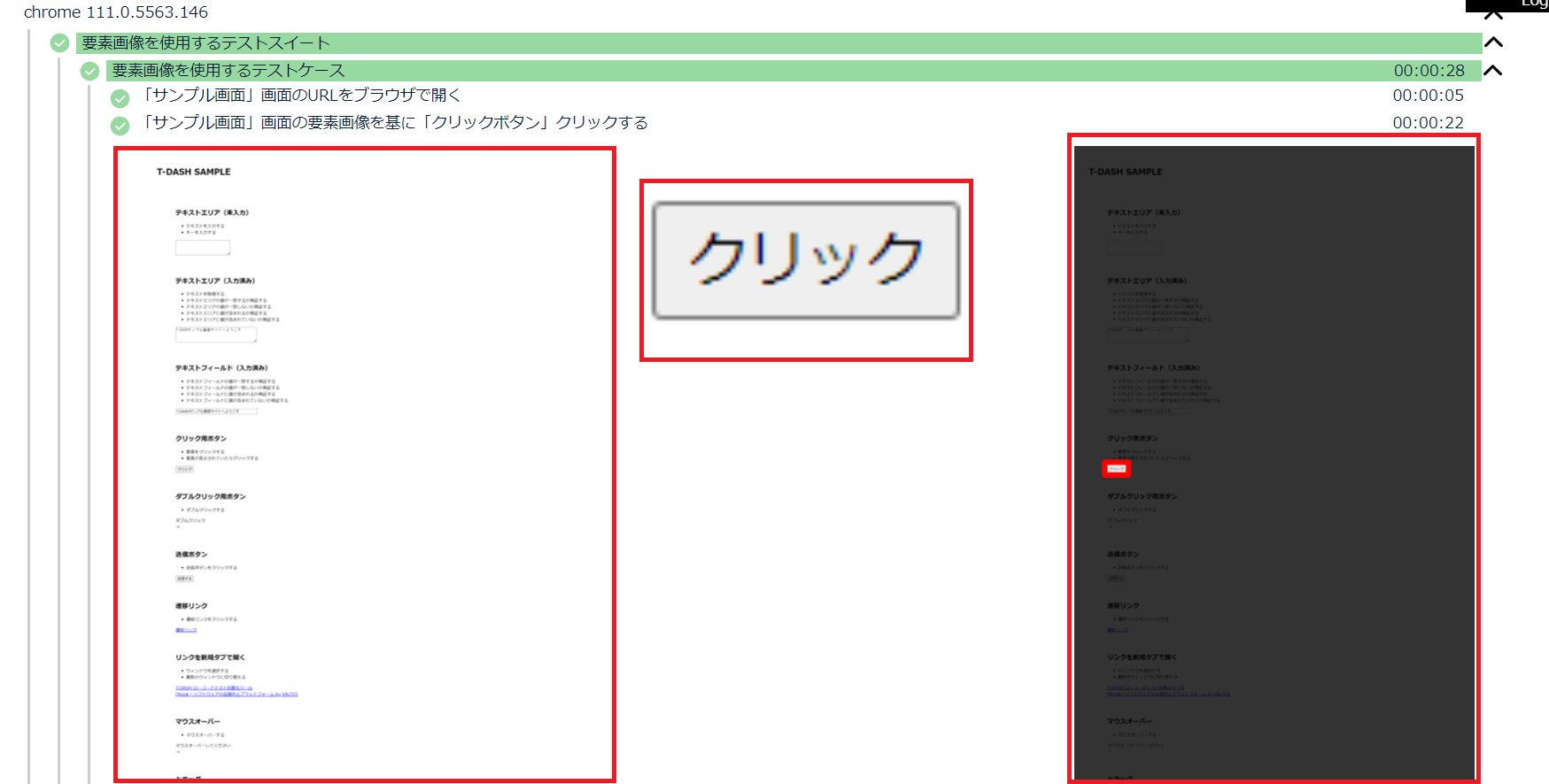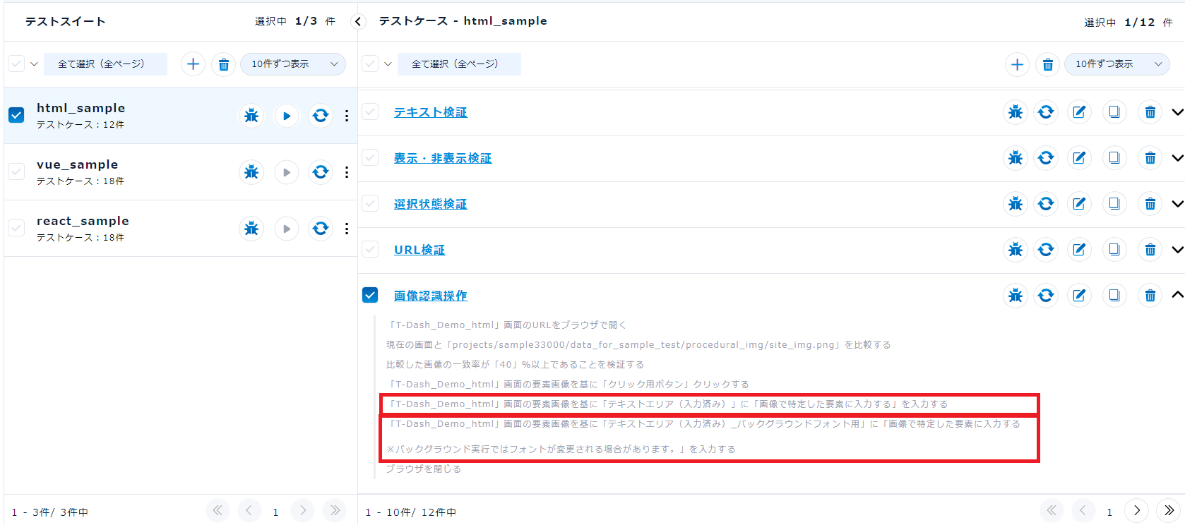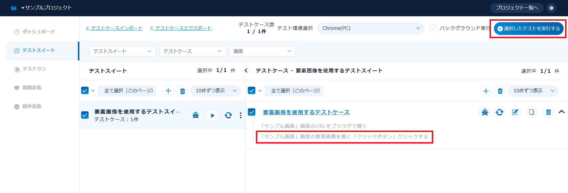 サンプルプロジェクト > html_sampleテストスイート > 画像認識操作テストケースでは、下記動作を2パターン含めています。片方は通常実行、もう片方はバックグラウンド実行を想定した手順であるため、必ずどちらかが失敗します。