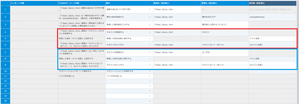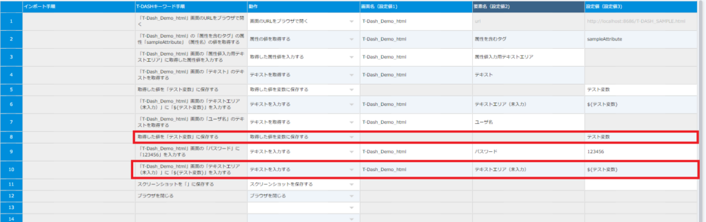 6行目:変数を利用します。(設定値に${テスト変数}を入れることで、「テスト変数」に保存された値をテキストエリア(未入力)に入力します)