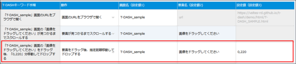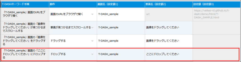 - 標準動作「ドラッグする」で指定した要素を、指定した場所でドロップします。