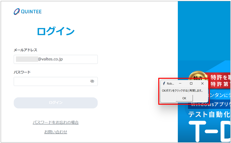 必要なブラウザ操作を行い、メッセージの “OK” ボタンをクリックすると、テスト実行が再開されます。
