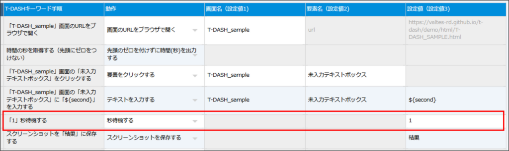 | 設定値(設定値3) | 待機する秒数を半角数字で入力する |