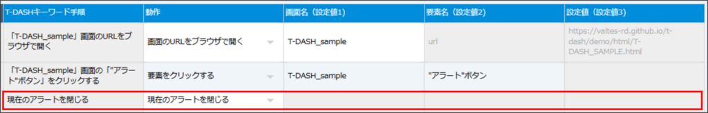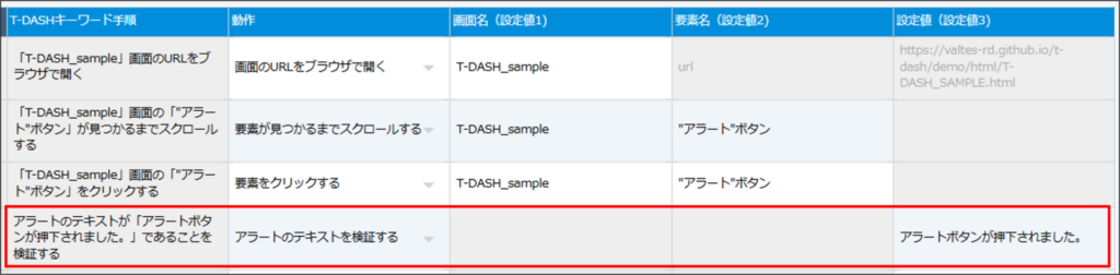| 設定値(設定値3) | 検証したいアラートメッセージのテキストを入力する |