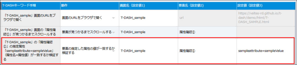 - 「設定値」の属性名が存在しない、または取得した属性値が「設定値」と不一致の場合は、本動作がエラーとなり、テスト実行失敗になります。
