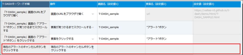 - アラートのテキストが「設定値」と不一致の場合、本動作がエラーとなり、テスト実行失敗になります。