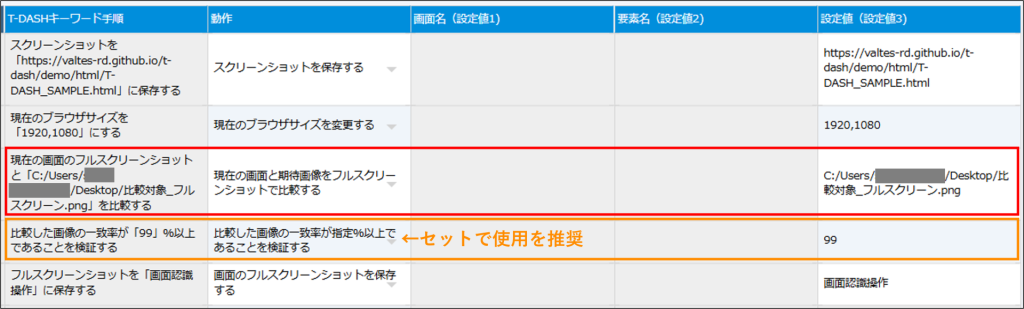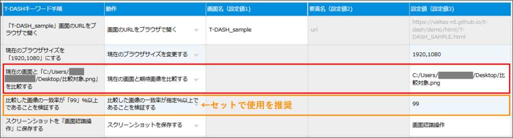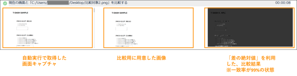 - 本動作後に、同カテゴリ内「比較した画像の一致率が指定%以上であることを検証する」のセット使用を推奨します。
