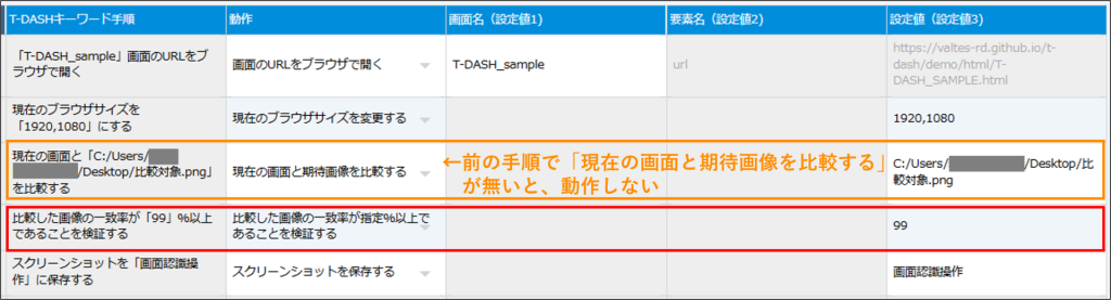 - 前の手順に「現在の画面と期待画像を比較する」が無いと、動作しません。