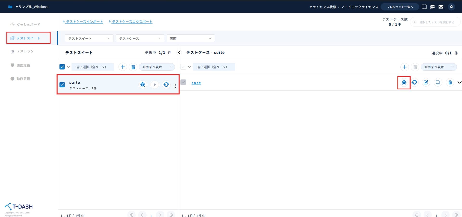 Windowsアプリプロジェクトでテストスイート画面を開き、テストケースのデバッグボタンをクリックする。(キャプチャ&リプレイ機能はテストスイートのデバッグボタンからは利用できません)