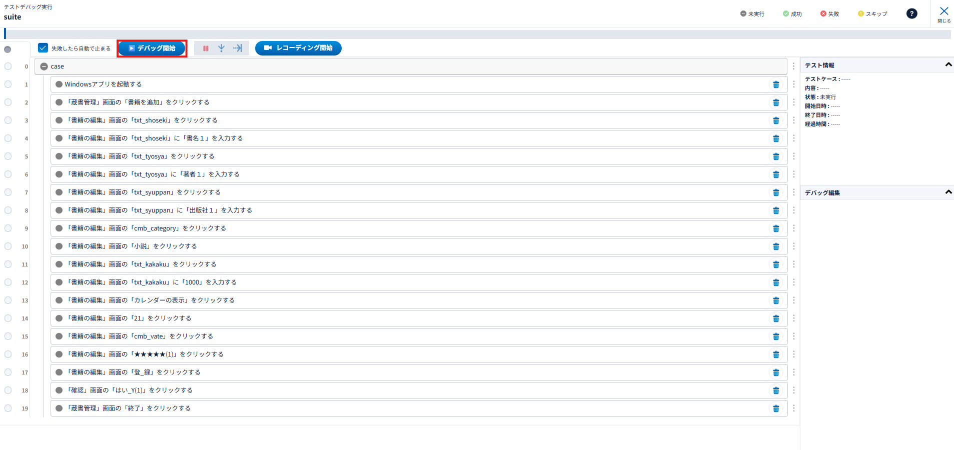 レコーディングした手順がデバッグ画面に反映されていることを確認し、「デバッグ開始」ボタンをクリックする。