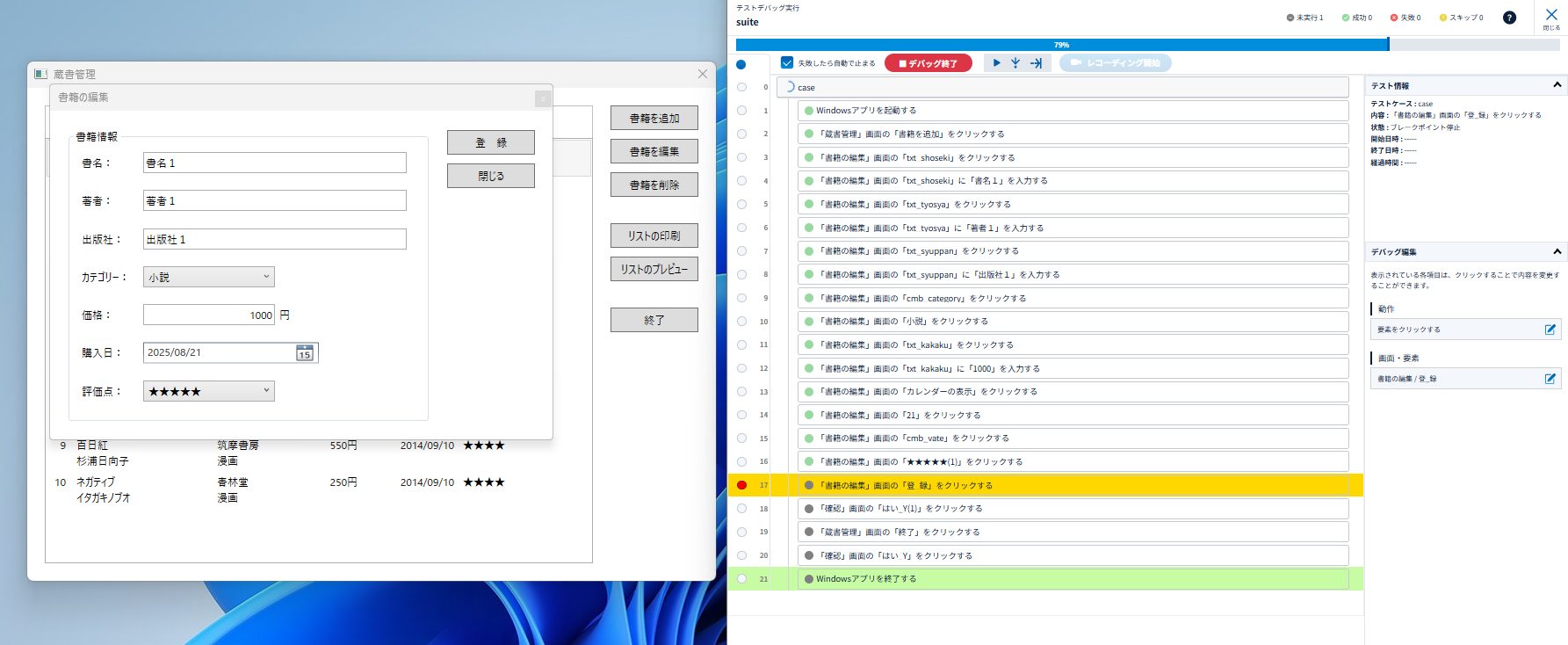 対象アプリの実装内容により手順が記録できない、また過剰に手順が記録される場合があります。手順に過不足が存在することにより後続の処理が失敗している場合は、デバッグ画面内で手順追加・手順削除を行うことにより解消することができます。