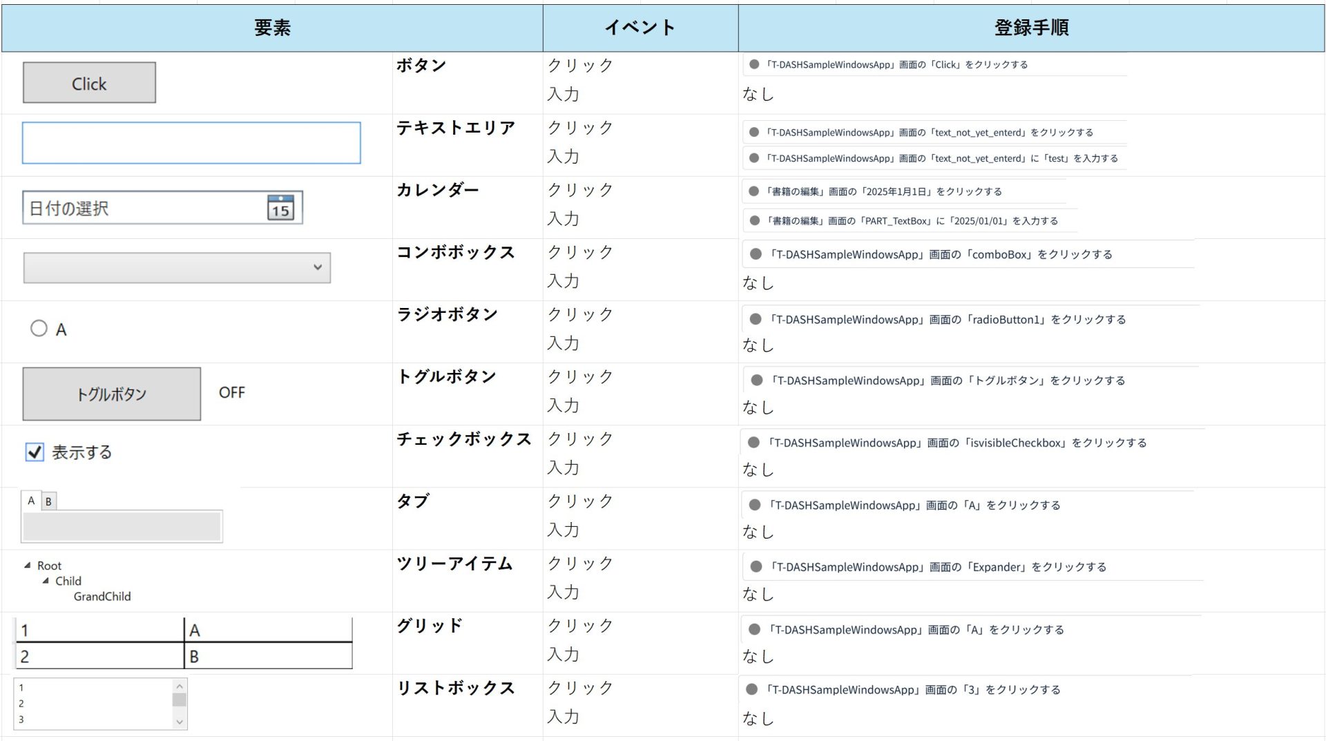各要素に対し操作を行うと追加される手順一覧