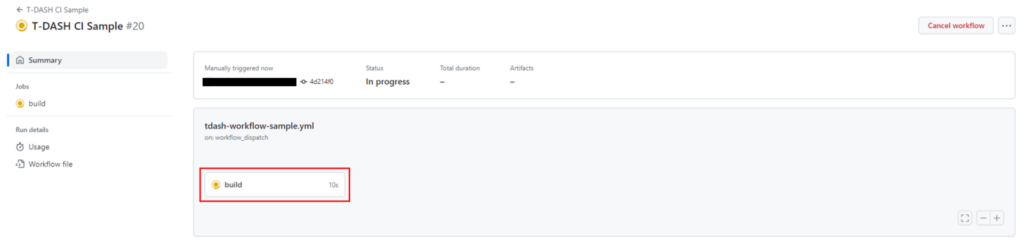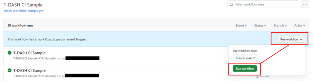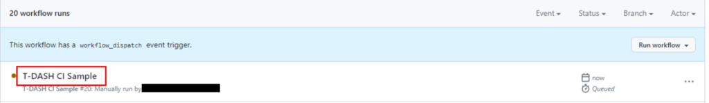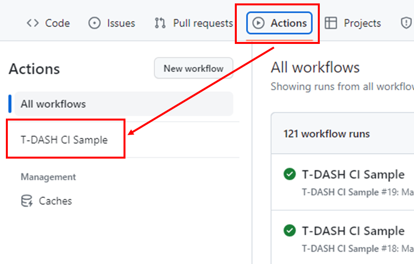 1. 「Actions」タブの「T-DASH CI Sample」をクリックする
