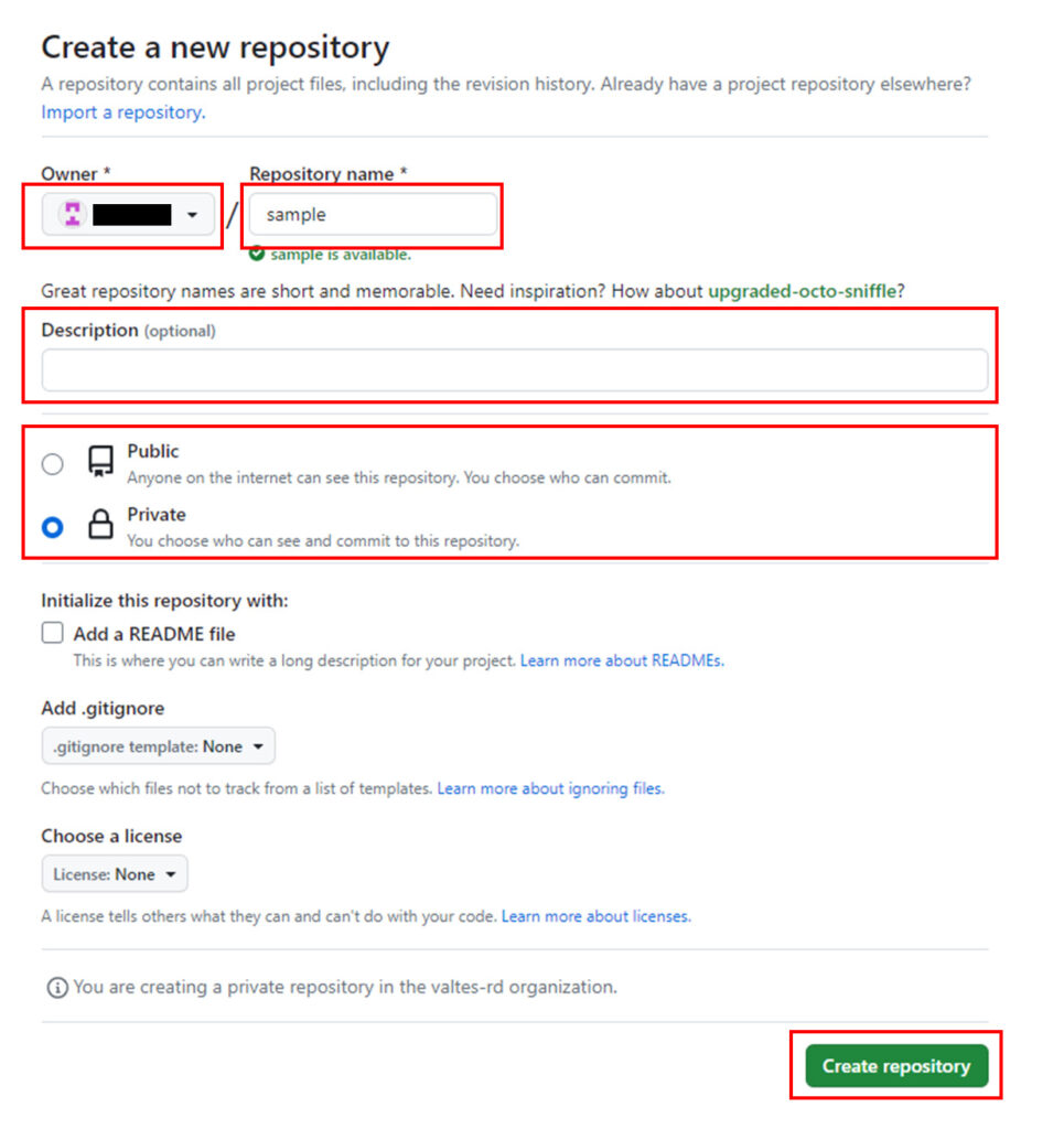 2. 任意のRepository情報を入力してCreate repositoryボタンをクリックする
