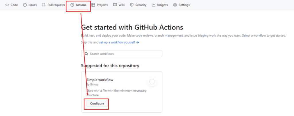 1. Githubの「Actions」タブをクリックし、「Simple workflow」の「Configure」ボタンをクリックする