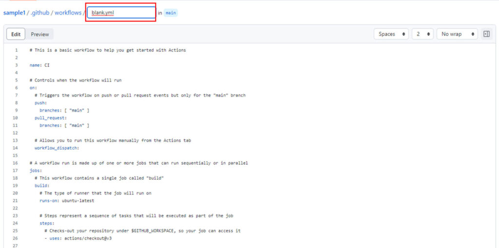 2. ワークフローのymlファイルの名称に任意の名前を設定する(ここではtdash-workflow-sample.ymlとしておきます)