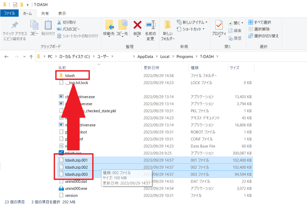 2. 「tdashフォルダ」に分割圧縮されたファイルを格納します。