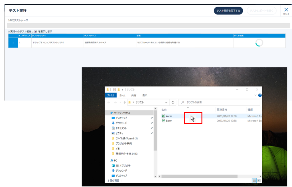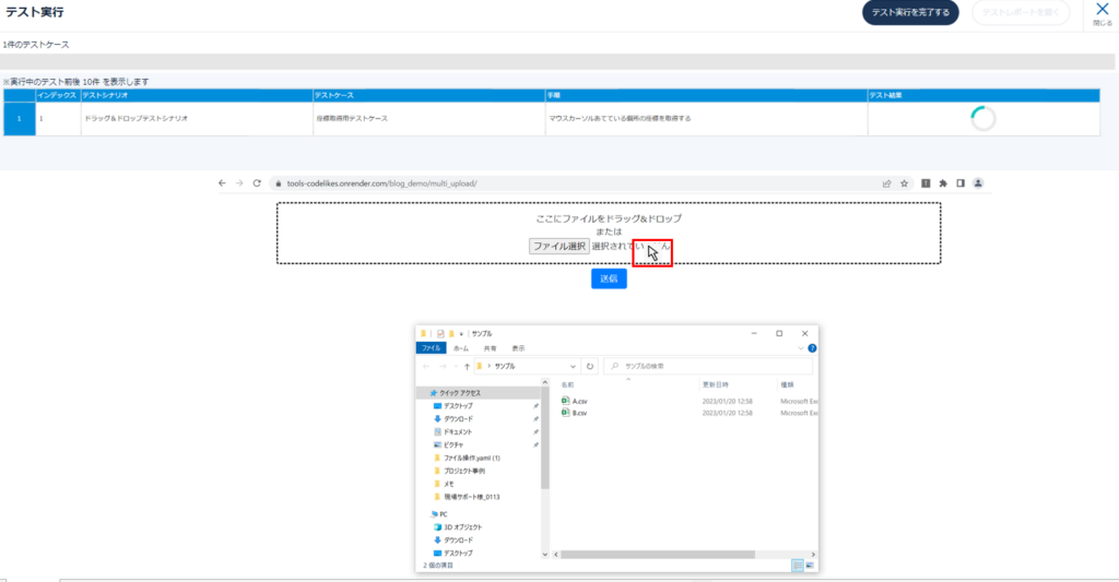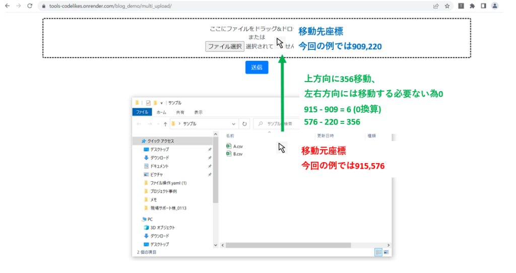 今回のサンプルでは座標指定でファイルエクスプローラーの複数ファイルをWebアプリ上にドラッグ&ドロップを行います。