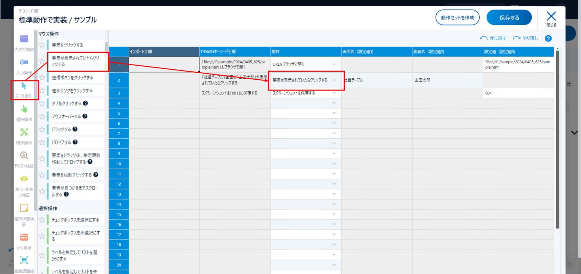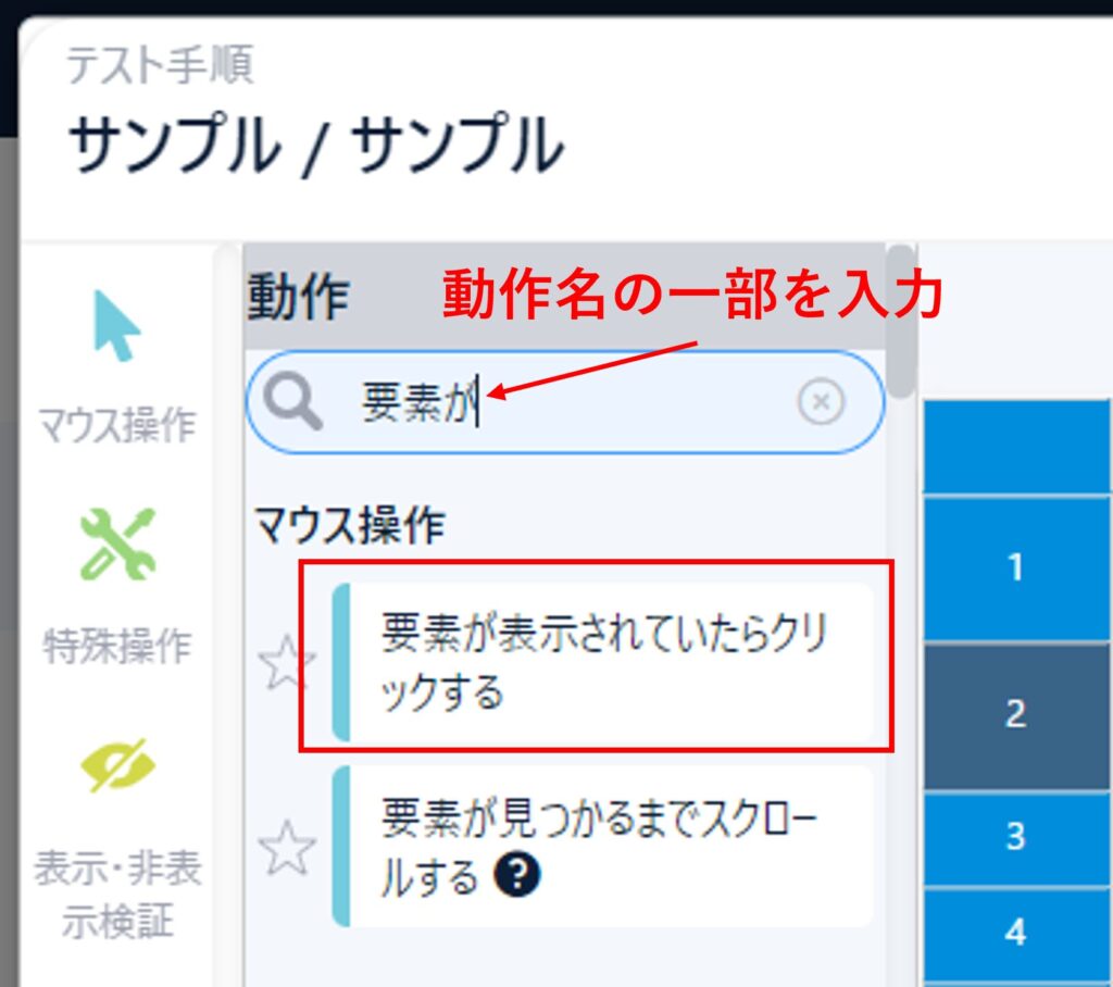 テスト手順作成画面で、URLを開いた後「マウス操作」→「要素が表示されていたらクリックする」を選択する。