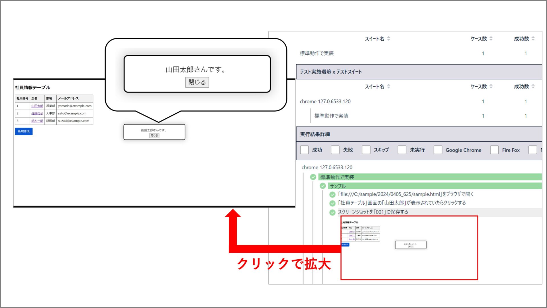 レポートにあるスクリーンショットを確認すると、正しく要素がクリックできていることが分かります。