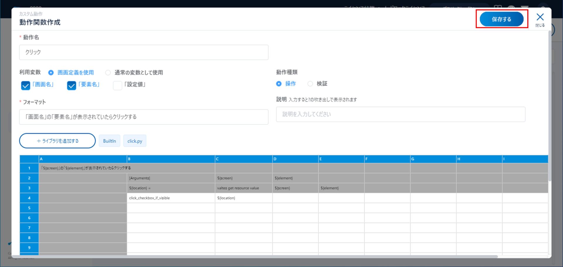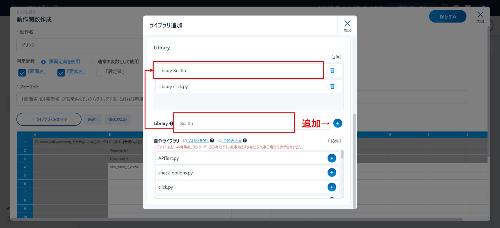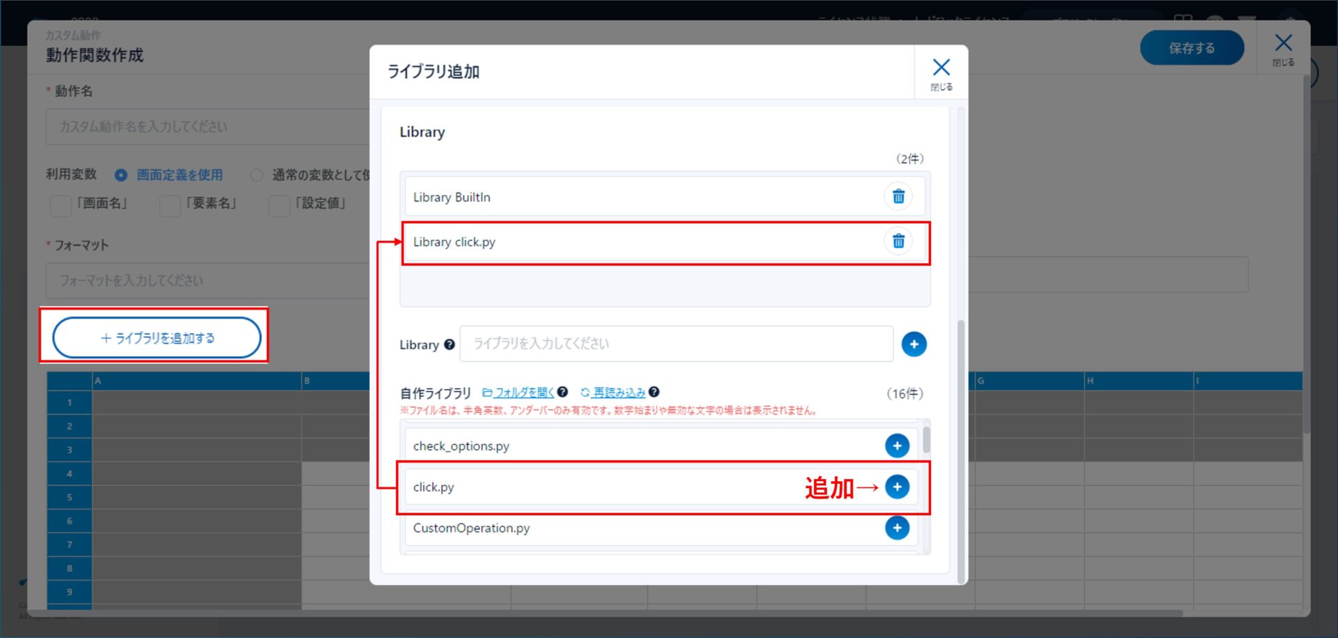 動作関数作成画面にて、「ライブラリを追加する」をクリックして、「自作ライブラリ」の中から、先ほど作成したclick.pyファイルを追加します。