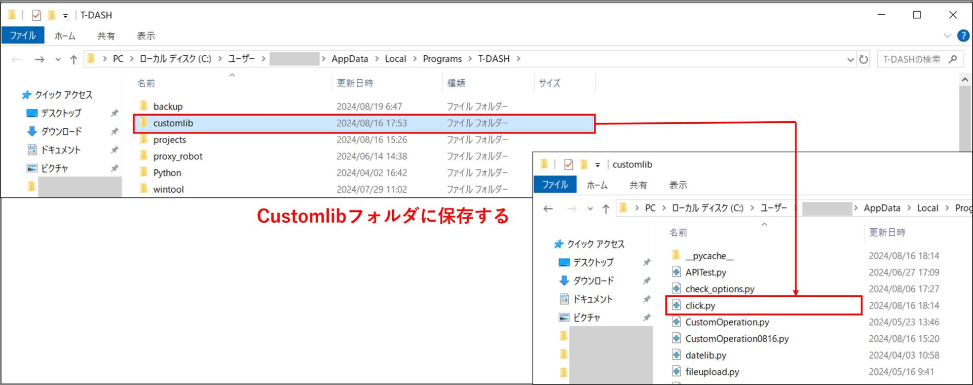 作成したファイルを「.py」の拡張子を付けて保存、T-DASHフォルダ内の「customlib」へ格納する。