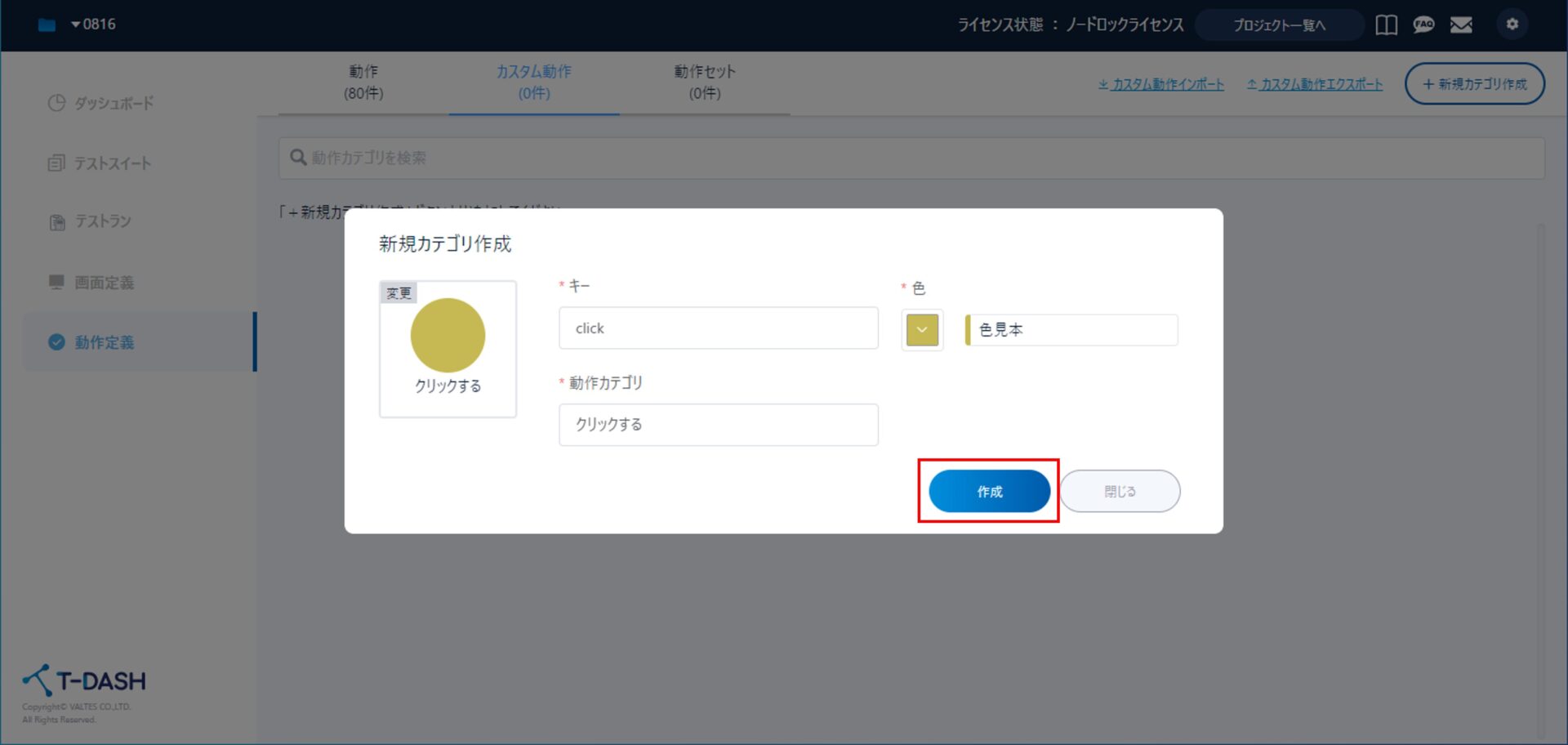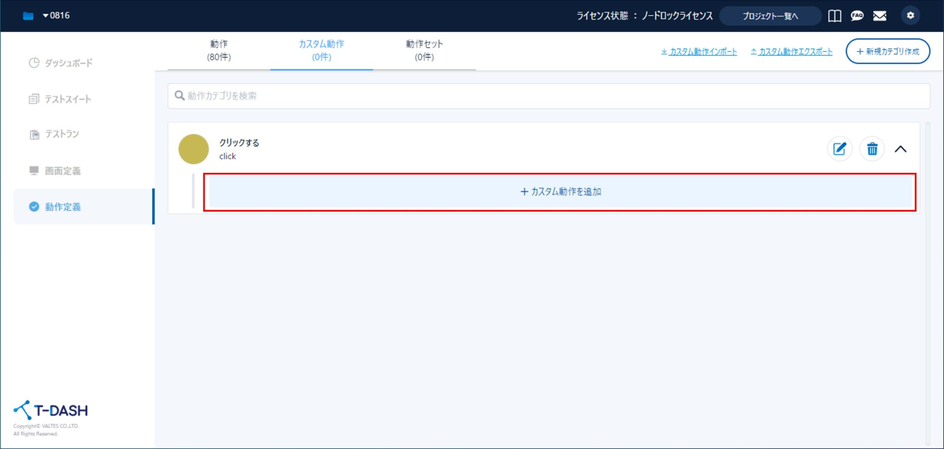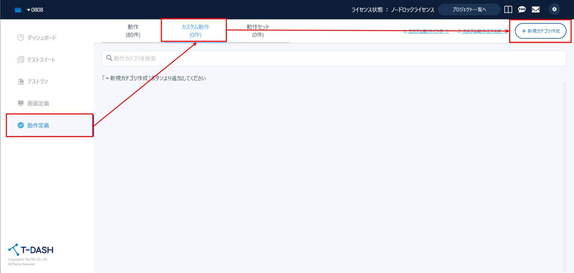 [動作定義]タブ→[カスタム動作]→[+新規カテゴリ作成]と進みます。