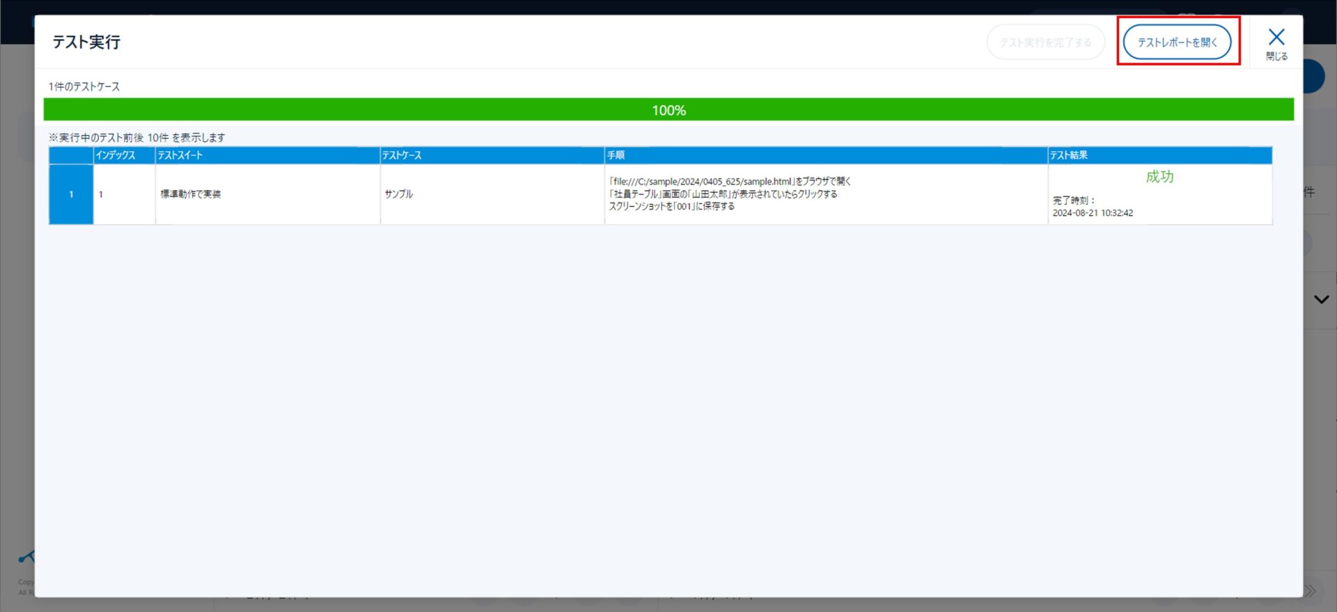完了後は、右上の「テストレポートを開く」をクリック
