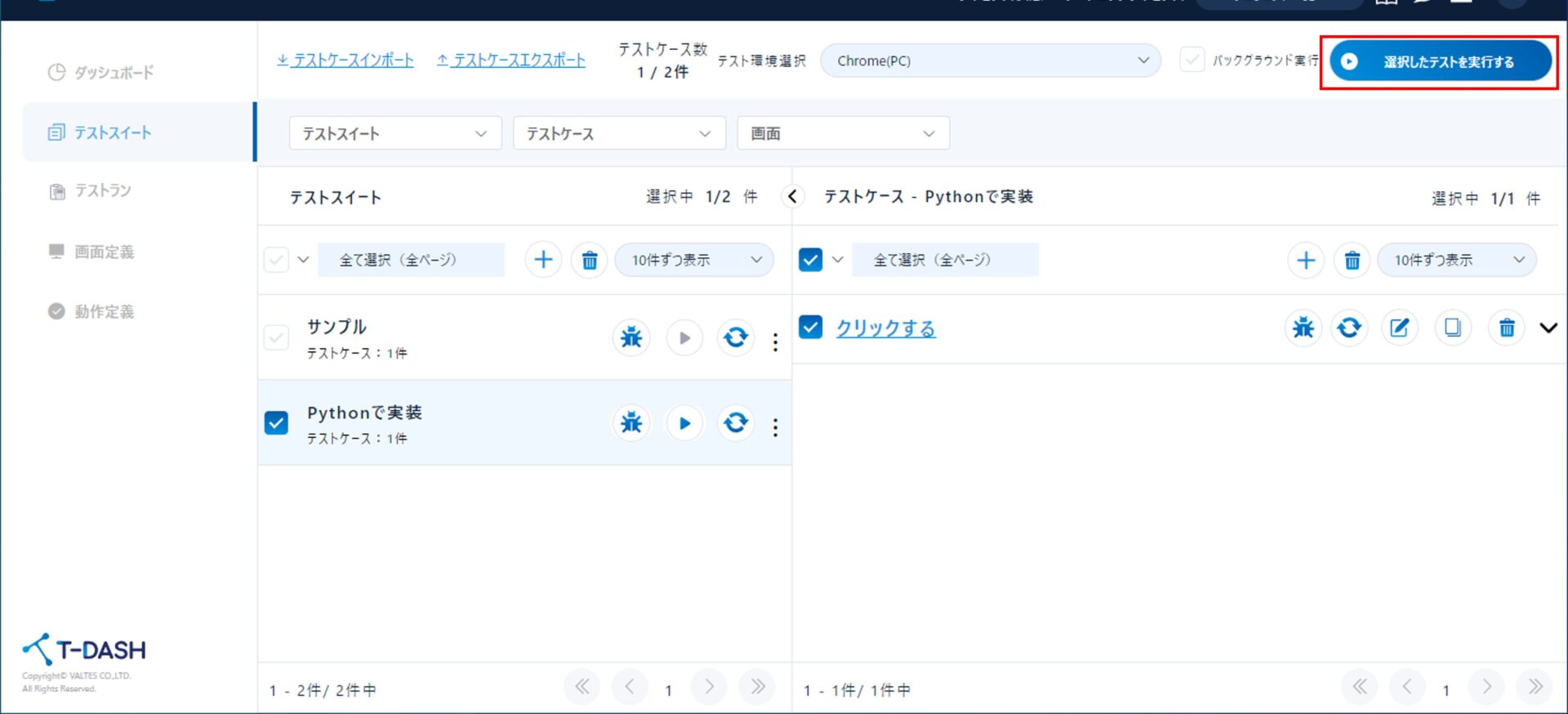 テスト実行したいテストスイートとテストケースにチェックがついていることを確認して、