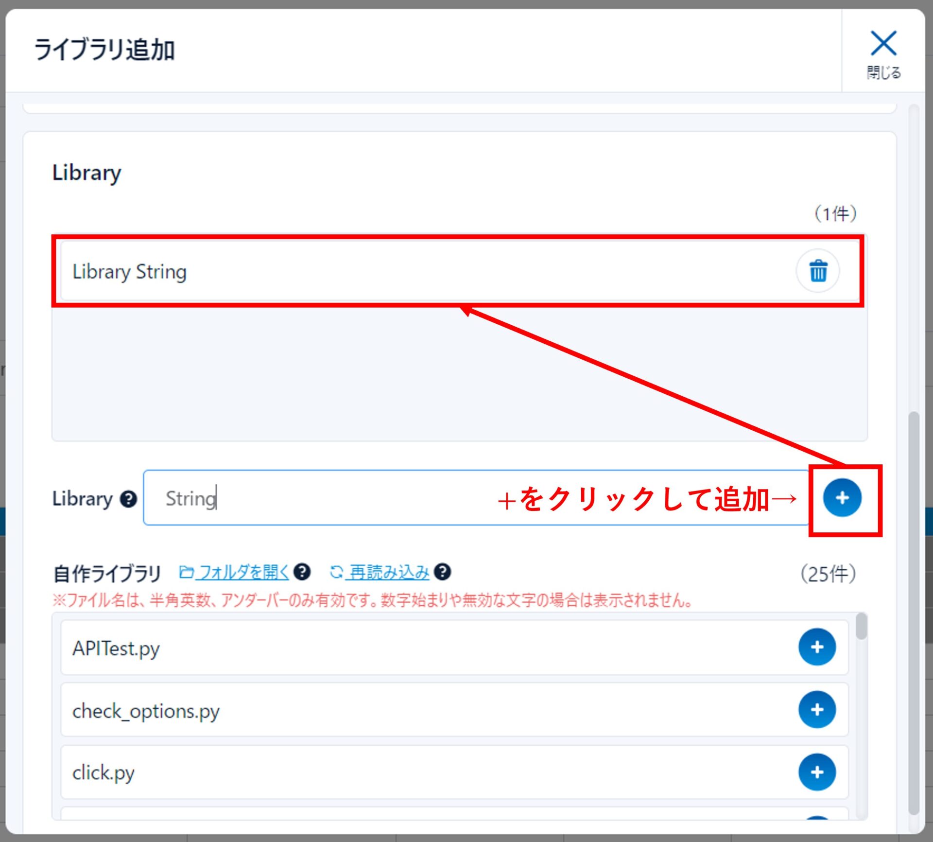 「+ライブラリを追加する」をクリックして、「Library」欄にStringと記載し、最後に「+」をクリックして追加します。