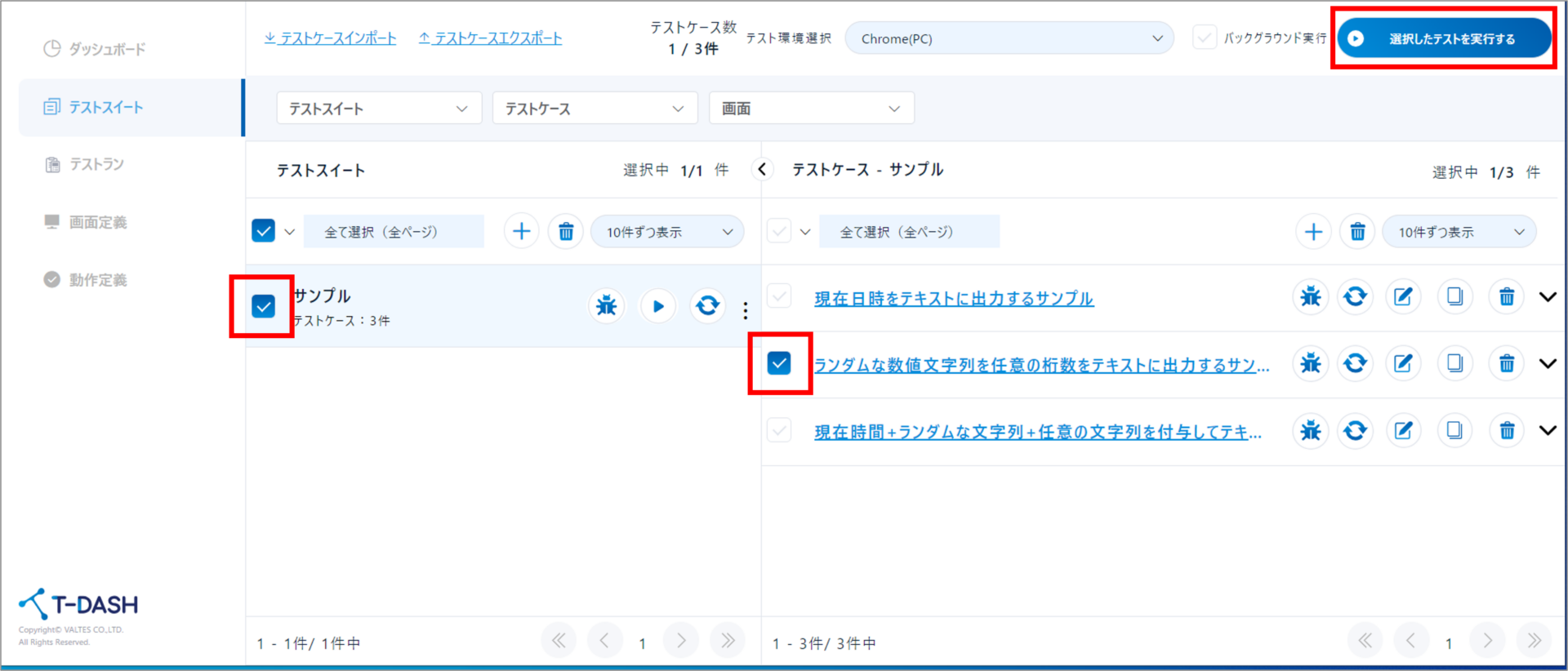実行したいテストスイートと、その中のテストケースにチェックを入れて、右上の「選択したテストを実行する」をクリックします。